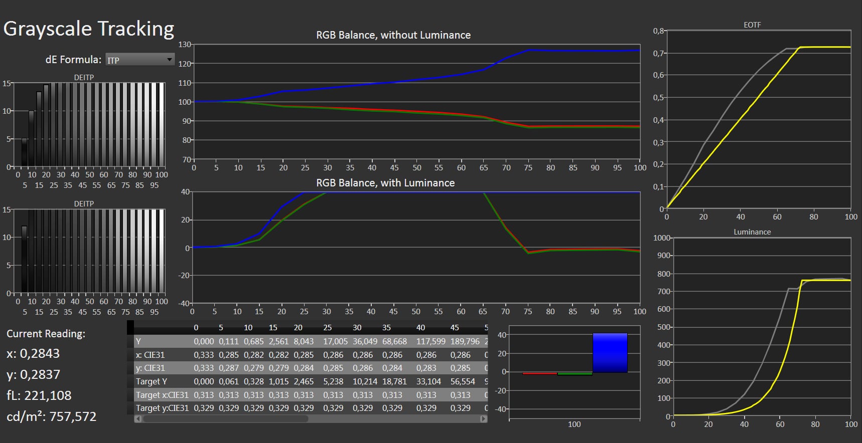 Som du måske ved, understøtter LG OLED TV autokalibrering vha. Calman softwaren. Det gør det muligt for entusiaster eller kalibratorer med det rigtige udstyr at kalibrere C2 relativt nemt og præcist. Vi henviser til vores LG C8 test fra 2018 for en gennemgang af systemet. Hvis man foretrækker den manuelle måde, så tilbyder LG også disse værktøjer. Der er et en håndfuld billedprofiler indbygget i LG C2, hvoraf de fleste er overflødige og blot forvirrer. Vil du have det mest nøjagtige SDR-billede skal du vælge 'ISF' eller 'Filmmaker Mode'. Som nævnt i vores test af LG G2 er 'ISF Bright' optimeret til gamma 2.2 (mere velegnet til brug i normale omgivelser) mens 'ISF Dark Room' er optimeret til BT.1886 (velegnet til mørke lokaler). I vores måling nedenfor målte vi 'ISF Dark' op mod BT.1886 for at visualisere forskellen sammenlignet med vores måling i testen af LG G2. Som du kan se er 'ISF Dark' på vores eksemplar af C2 meget nøjagtig, hvorfor vi ikke gik videre med en kalibrering med 2-punktsindstillinger. Godt gået, LG! Du bør derimod undgå 'Standard' og 'Vivid'. 'Game'-profilen er ikke fantastisk hvad angår billednøjagtighed, men dog markant bedre end hvad man finder i mange andre TV-skærme fra andre mærker. Vi henviser til vores målinger nedenfor og til højre. Vi vil desuden fremhæve vigtigheden i at huske at deaktivere energibesparelsesfunktionen fra menuen på LG OLED TV idet den giver et væsentligt mørkere billede end tiltænkt. Den er rykket og findes nu under: Device Self Care -> Energy Saving Step -> Off. Hvad angår HDR, så anbefaler vi 'Cinema' eller 'Filmmaker Mode', som er mere eller mindre identiske. Undgå 'Standard' og 'Vivid'. Igen, 'Game' i HDR er heller ikke særlig god. LG C2 rammer 98% af DCI-P3 og 71% af Rec.2020 farverummene, hvilket er på niveau med andre LG OLED TV inkl. sidste års C1. Vi kommer nærmere ind på HDR-lysstyrke og maksimal lysstyrke i afsnittet om billedkvalitet.Øvrige billedprofiler