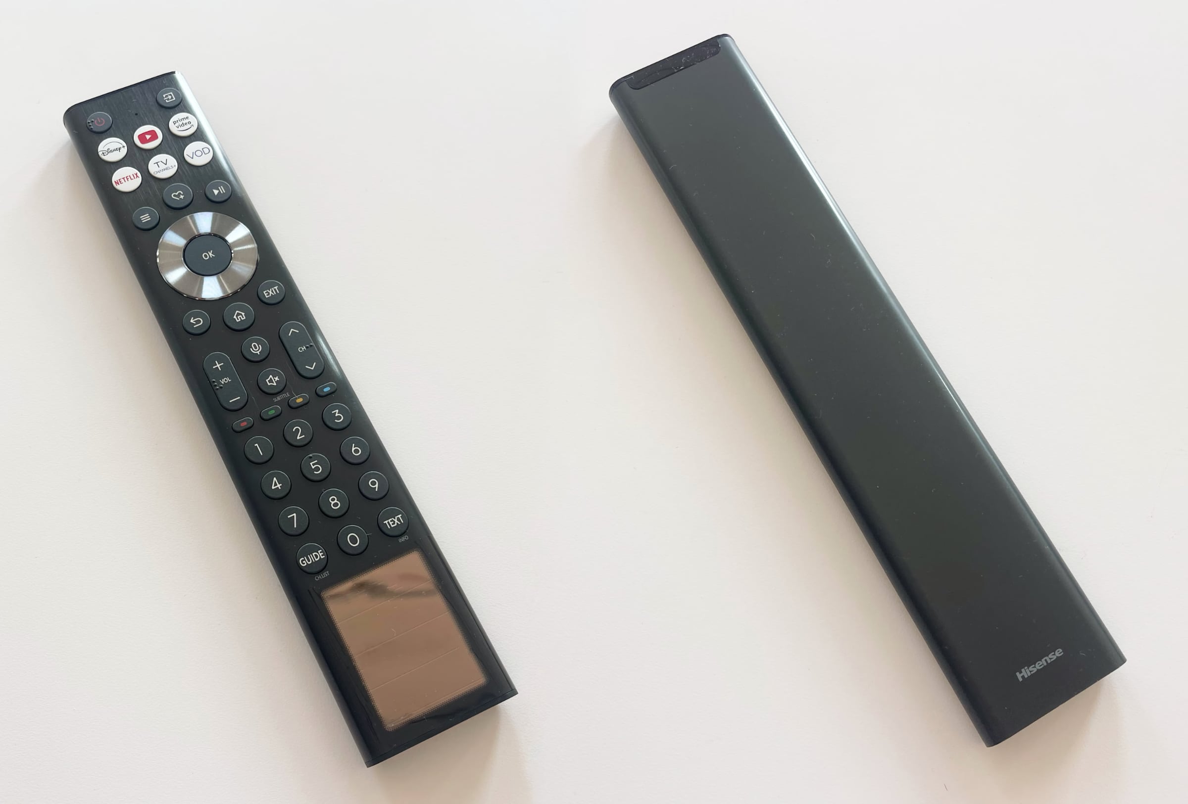 Hisenses fjernbetjening har fin form og tyngde, og oplades med USB-C, f.eks. gennem TV'ets USB-C port. Det er en lille detalje, men det gør det supernemt at oplade fjernbetjeningen. Der sidder et lille solpanel nederst på fjernbetjeningen, som oplader batteriet. Samsung introducerede for nogle år tilbage et solpanel på deres fjernbetjening, men det sidder på bagsiden, hvorfor man skal huske at vende fjernbetjeningen om, når man ikke bruger den – og hvem får gjort det? Det er ikke tilfældet hos Hisense, men til gengæld er solpanelet ikke så kønt. Til gengæld har fjernbetjeningen et virvar af knapper, hvilket desværre ikke bidrager til brugervenligheden. Vi opfordrer Hisense til at nedbringe antallet drastisk. Navigationsfeltet i midten ligner et hjul, men kan hverken drejes eller betjenes med touch. Det er regulære knapper, der fungerer godt til navigation, og back-knappen sidder logisk placeret lige nedenunder til venstre. I virvaret af knapper finder man seks sponsorerede knapper, hvor TV Channels+ knappen dog i Danmark åbner normale tv-kanaler (i andre lande åbnes reklamefinansierede tv-kanaler). Nedenunder sidder en knap med et hjerte på kaldet 'Custom', som kan brugerkonfigureres til at åbne en specifik app eller HDMI-port. Det er smart og de seks knapper ovenfor burde have samme funktion (og intet print på).Annonce:Overordnet set en fin fjernbetjening, der er responsiv (forbinder med Bluetooth, så du ikke skal pege direkte på TV'et), men med alt for mange knapper og sponsorerede elementer, hvilket trækker ned i den overordnede brugeroplevelse.Fjernbetjenings hjerte-knap kan konfigureres af brugere til f.eks. at skifte til en specifik app eller HDMI-port. Foto: FlatpanelsTV-lyd