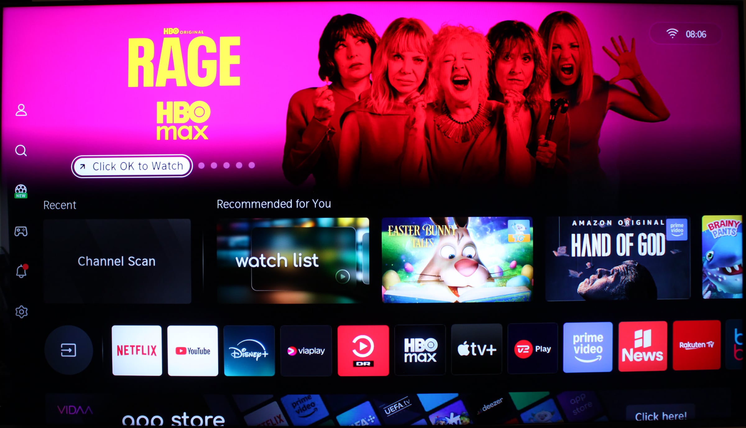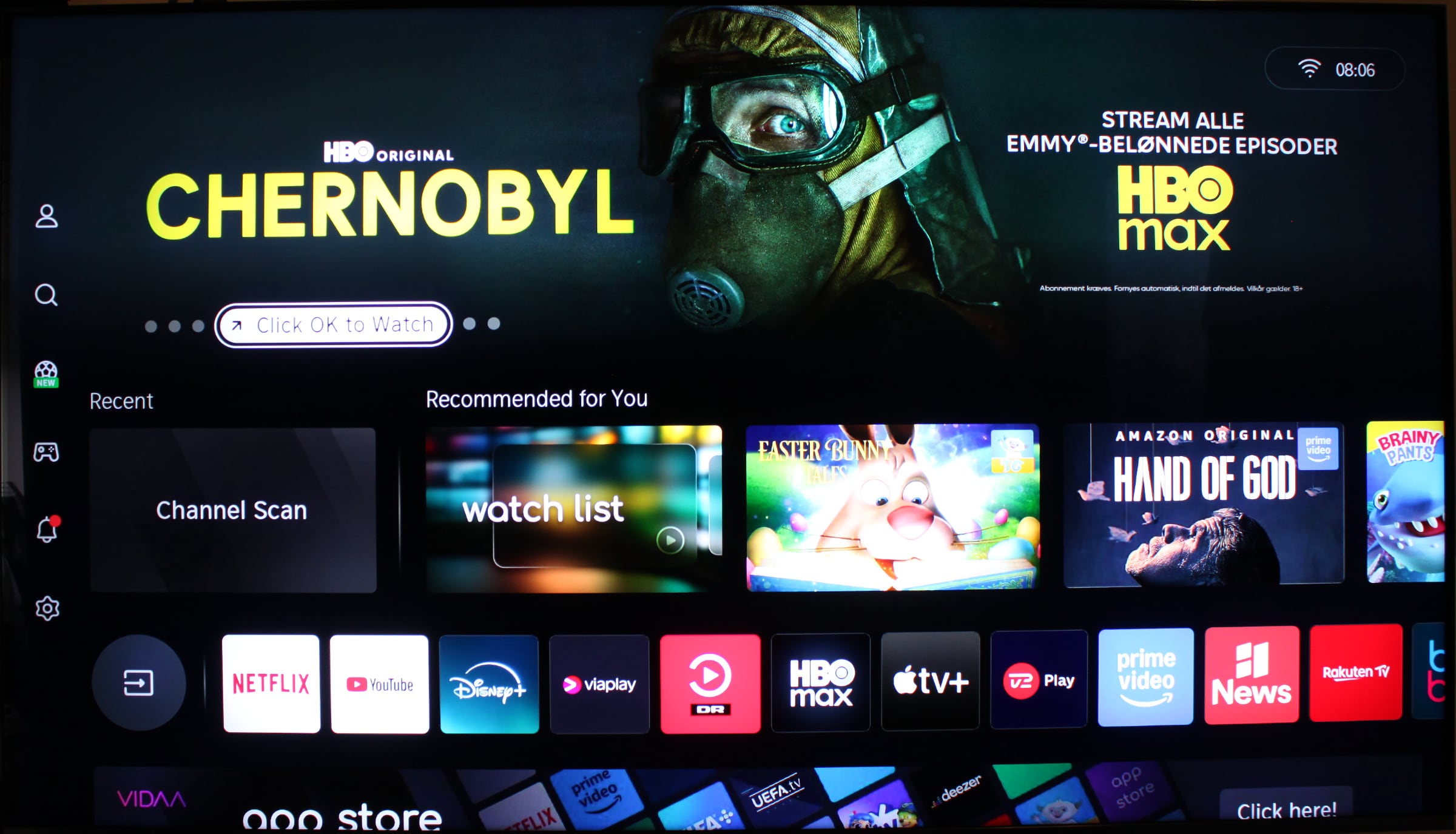 Vi har efterhånden stiftet beskendtskab med adskillige generationer af Google TV, Apple tvOS, LG webOS, Samsung Tizen og andre TV-styresystemer. Hisense kører i Europa solo med eget Vidaa OS, der også licenseres til andre mærker såsom Toshiba. Opsætningen er ligetil. Man kan bruge fjernbetjeningen eller Vidaa appen. Undervejs opfordres man til at acceptere en række vilkår for reklamer og dataindsamling, herunder ACR (Automatic Content Recognition), som holder øje med, hvad du ser på skærmen. Man får altså hurtigt indtryk af, at Vidaa er opbygget om reklamer og dataindsamling, og allerede under opsætningen ses en stor reklame for Netflix.Der er en del reklamer i Vidaa, allerede under opsætning af TV'et (højre). Foto: Flatpanels På hovedskærmen vil man bemærke, at Vidaa har samme reklamekarrusel øverst. Her fremhæves indhold fra partnere. Lige under findes en række med installerede apps, hvor man selv kan vælge rækkefølgen. Længere nede findes indholdsrækker fra udvalgte streamingtjenester, hvor titler fremhæves, ligesom man kender det fra f.eks. Google TV. Brugeren har ikke kontrol over disse indholdsrækker. Vidaa er et linux-baseret styresystem, hvorfor meget af kodebasen grundlæggende er den samme som i andre TV-styresystemer. Det betyder dog ikke, at streaming-apps automatisk kan køre på Vidaa. Udviklerne skal dedikere arbejdstimer og udsende Vidaa apps. Det har historisk været en svaghed for Vidaa, for selvom der er bred support af internationale apps, såsom Prime Video, Netflix og Disney+, har der været mangler blandt danske apps. Hisense arbejder på sagen, oplyser de, og der er da også begyndt at ske noget. Senest er TV 2 Play landet på Vidaa i tillæg til danske apps som DRTV og Viaplay. Der findes stadig ikke apps fra tv-distributører som YouSee og Norlys. Apps fungerer overordnet fint, men der er begrænsninger: DRTV er HbbTV-versionen til Smart TV, der ikke kan afspille alt indhold og ikke er så udbygget som appen til Apple TV og Google TV. Apple TV appen giver kun adgang til Apple TV+, altså ingen filmleje/køb direkte i appen. I stedet kan man leje film fra Rakuten. Navigationen på Vidaa-hjemmeskærmen er derimod overraskende hurtig, og fjernbetjeningen føles responsiv. Apps åbner uden større forsinkelse, men man kommer alligevel igennem en del loading-skærme. Animationerne, når man navigerer i Vidaa, kan dog til tider være lidt grove, hvilket gør, at Vidaa ikke føles helt lige så flydende og lækkert, som det kunne være. Efter at have trykket på to af fjernbetjeningens sponsorerede app-knapper hurtigt i træk oplevede vi, at videostreaming ikke længere havde billede i nogen apps. Det krævede, at strømmen blev trukket så TV'et genstartede.TV-platformen Vidaa. Foto: Flatpanels Hisense U8Q er det første TV udstyret med MediaTek Pentonic 800 (MT9655) chippen, som afløser Pentonic 700 fra blandt andet TCL Google TV. Vi kan ikke benchmarke Pentonic 800, da vores benchmark-apps ikke kører på Vidaa, men på papiret er Pentonic 800 ikke væsentlig hurtigere end 700. Den primære fordel ved Pentonic 800 er, at den kan supportere flere HDMI 2.1 porte, hvilket Hisense har omfavnet med tre HDMI 2.1 og én USB-C med DisplayPort. Ros for det da to HDMI 2.1 porte, hvoraf én er HDMI eARC, er og forbliver en begrænsning på mange TV-skærme. Der findes en håndfuld spil i Vidaas app-butik, men det er helt simple webspil. Pentonic 800 er ikke kraftig nok til afvikle noget i nærheden af konsolkvalitet. Vidaa opdateres efter køb og Hisense lover op til 8 års support. U8Q leveres med Vidaa 9.0 præ-installeret. Vidaa har ikke god multitasking, så hvis man streamer video i en app, trykker på hjem-knappen for at komme til hovedskærmen, og går ind i appen igen, vil langt de fleste apps starte helt forfra i stedet for at fortsætte videostreaming eller vende tilbage til den menu, man var i. Det gør, at Vidaa føles for "light" i mange situationer. YouTube appen er en undtagelse. Apple AirPlay 2 og Apple Home understøttes, men ikke Google Cast (Chromecast). Med AirPlay kan man sende mediefiler trådlåst over på U8Q via en iPhone/iPad/Mac og det fungerede som tiltænkt, men Android-brugere vil nok savne Google Cast. Vidaa trænger overordnet til polering og vi vil sidestille det mere med LGs webOS og Samsungs Tizen end Apples mere polerede og udbyggede tvOS eller Googles udbyggede Google TV, om end Vidaa med sit reklamefokus minder meget om Google TV. Som nævnt savner vi visse apps i Vidaa, både danske og internationale, såsom Xbox og Nvidia GeForce Now, samt den fulde DRTV og Apple TV app. I dansk sammenhæng er Vidaa efterhånden gangbar, men vi savner bare lidt hele vejen rundt før det bliver rigtig godt, og udviklingen indenfor reklamer bekymrer os. Kigger man ud over Vidaa, understøtter Hisense naturligvis funktioner som HDMI eARC og HDMI CEC-styring. Vi oplevede under testen ingen problemer. Begge systemer var aktiverede fra start så eksterne HDMI-enheder kan styres med TV'ets fjernbetjening – og vice versa. Der er indbygget WiFi 6E og Bluetooth 5.3 – Hisense er helt fremme i feltet. Ethernet-porten er dog begrænset til 100 Mbps – ligesom på alle andre TV-skærme. Vi testede om HDMI 2.1 QMS virkede med tanke på, at Hisense har opgraderet til MediaTek Pentonic 800 chip. Det gør det desværre ikke. Såfremt QMS til at skifte billedfrekvens uden sort mellemliggende skærm (med Apple TV 4K) er vigtig for dig, skal du i stedet kigge på LG og Samsung.Betjening