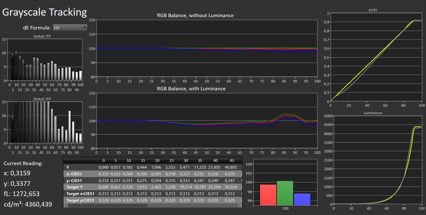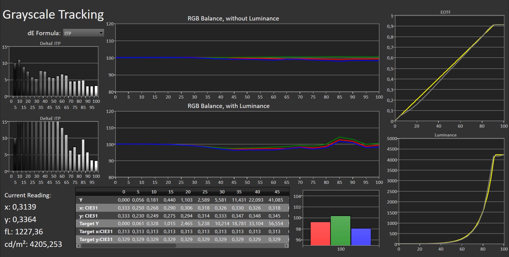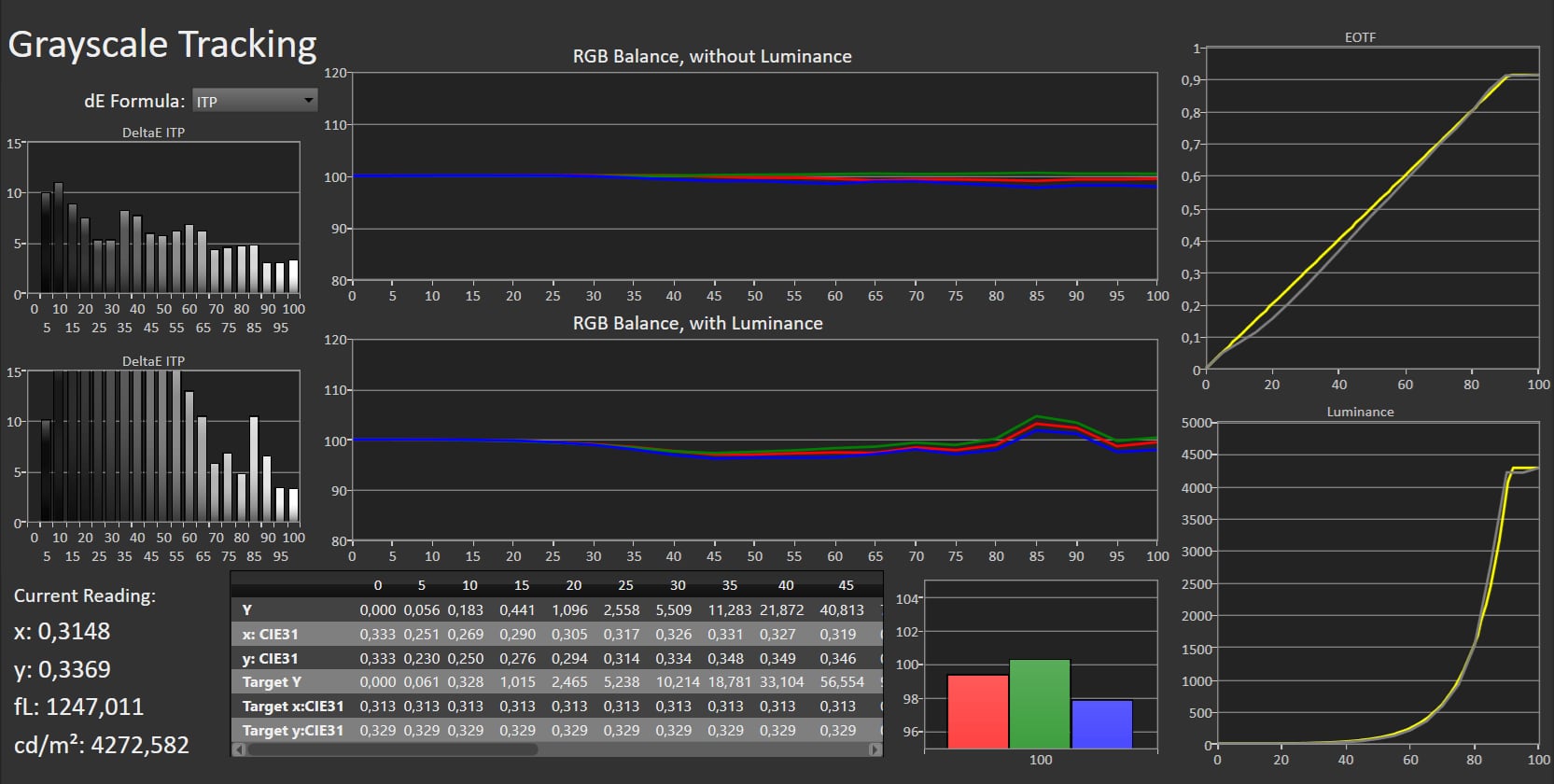 Ligesom andre TV-producenter har Hisense et virvar af billedprofiler – det forvirrer mere end det gavner. U8Q står som udgangspunkt i 'Energy Saving', der ikke er præcis. Dynamic og Standard er også krads. Cinema-profilen kan gå an til oplyste lokaler, men det mest præcise udgangspunkt er Filmmaker Mode, om end den også mangler lidt præcision. I forbindelse med vores kalibrering noterede vi os, at gamma BT.1886 ikke korrekt følger BT.1886, hvilket er en fejl – den har for høj gamma så lyset ikke helt matcher. Vælg i stedet Gamma 2.2 i billedmenuen, hvis du kalibrerer til mørke rum (Gamma 2.2-indstillinger giver gamma 2.4) eller Gamma 2.0 (giver gamma 2.2) til mere oplyste rum. Vi noterede os samtidig, at der er indbyrdes afhængighed mellem indstillingerne Backlight, Contrast og Gamma, hvilket gør kalibreringen af lysskalaen i SDR mere vanskelig end den burde være. Vi nåede et tilfredsstillende kalibreringsresultet, men noterer os, at miniLED-zonerne er ret uforudsigelige og kalibreringen ikke måler ens to gange i træk. Det er et generelt kendetegn for miniLED-zonestyring i LCD TV. Hisenses Game-profil til spilbrug fungerer ligesom hos LG. Det vil sige, at den aktiveres automatisk (eller manuelt) ovenpå de andre billedprofiler, når TV'et registrerer et HDMI-signal fra en spilkonsol. Det er efter vores opfattelse en bedre måde at gribe det an på, idet man kan fastholde sine kalibrerede billedindstillinger, samtidig med, at input-forsinkelse på signalet nedbringes. Man kan f.eks. aktivere Game mode ovenpå Filmmaker Mode. Dermed fremvises PC/konsolspil som tiltænkt. I HDR er det igen Filmmaker Mode, du skal have fat i. U8Q når højlys på over 4000 nits, men kun i et 10% vindue. I et 1% vindue, hvor de lyseste elementer ofte bruges i film og serier, når den lidt over 2000 nits. Den høje lysstyrke opretholdes i Game-profil. Vi målte stabiliteten af lyset og efter 1 minut faldt det kun med 100-200 nits til 3900 nits. Modsat TCL bruger Hisense ikke boost-funktion til at nå 4000 nits, hvilket gør, at miniLED-zonerne er lidt mindre uforudsigelige. Til Dolby Vision-indhold anbefales Dolby Vision Dark-billedprofilen. Farvedækning af DCI-P3 og Rec.2020 blev målt til henholdsvis 97% og 74%, hvilket svarer til andre high-end LCD TV. Det matcher ikke QD-OLED.Målte billedprofiler