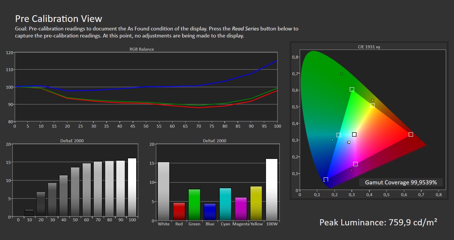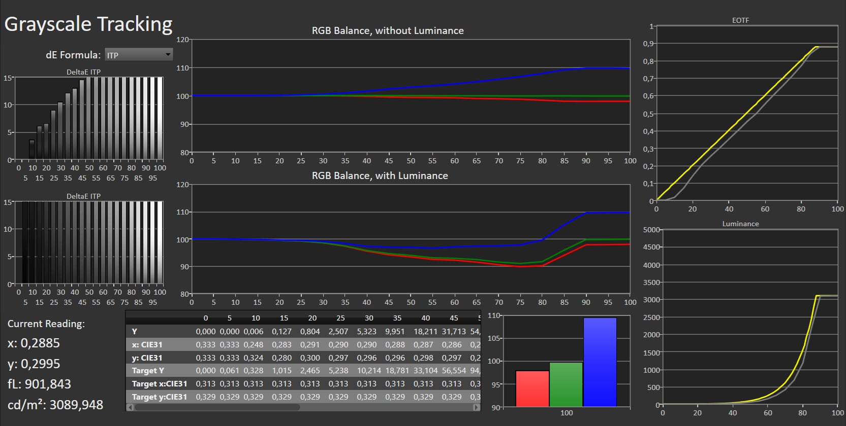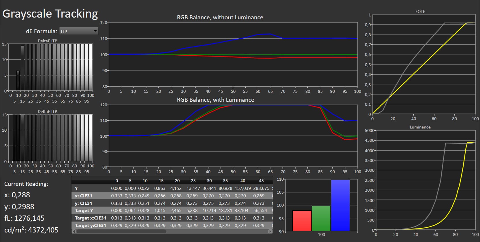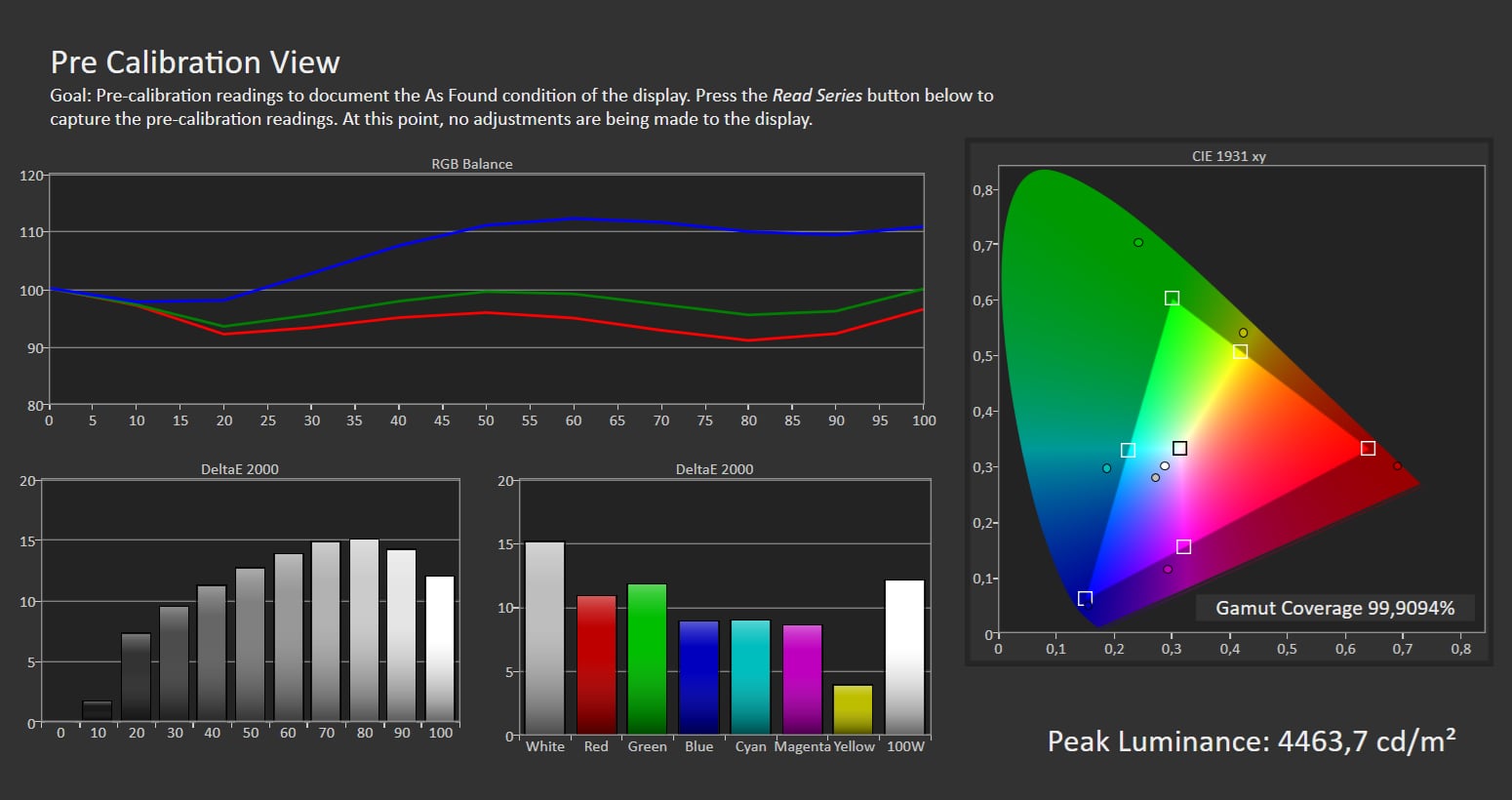 Ligesom andre TV-producenter har Hisense et virvar af billedprofiler – det forvirrer mere end det gavner. U8Q står som udgangspunkt i 'Energy Saving', der ikke er præcis. Dynamic og Standard er også krads. Cinema-profilen kan gå an til oplyste lokaler, men det mest præcise udgangspunkt er Filmmaker Mode, om end den også mangler lidt præcision. I forbindelse med vores kalibrering noterede vi os, at gamma BT.1886 ikke korrekt følger BT.1886, hvilket er en fejl – den har for høj gamma så lyset ikke helt matcher. Vælg i stedet Gamma 2.2 i billedmenuen, hvis du kalibrerer til mørke rum (Gamma 2.2-indstillinger giver gamma 2.4) eller Gamma 2.0 (giver gamma 2.2) til mere oplyste rum. Vi noterede os samtidig, at der er indbyrdes afhængighed mellem indstillingerne Backlight, Contrast og Gamma, hvilket gør kalibreringen af lysskalaen i SDR mere vanskelig end den burde være. Vi nåede et tilfredsstillende kalibreringsresultet, men noterer os, at miniLED-zonerne er ret uforudsigelige og kalibreringen ikke måler ens to gange i træk. Det er et generelt kendetegn for miniLED-zonestyring i LCD TV. Hisenses Game-profil til spilbrug fungerer ligesom hos LG. Det vil sige, at den aktiveres automatisk (eller manuelt) ovenpå de andre billedprofiler, når TV'et registrerer et HDMI-signal fra en spilkonsol. Det er efter vores opfattelse en bedre måde at gribe det an på, idet man kan fastholde sine kalibrerede billedindstillinger, samtidig med, at input-forsinkelse på signalet nedbringes. Man kan f.eks. aktivere Game mode ovenpå Filmmaker Mode. Dermed fremvises PC/konsolspil som tiltænkt. I HDR er det igen Filmmaker Mode, du skal have fat i. U8Q når højlys på over 4000 nits, men kun i et 10% vindue. I et 1% vindue, hvor de lyseste elementer ofte bruges i film og serier, når den lidt over 2000 nits. Den høje lysstyrke opretholdes i Game-profil. Vi målte stabiliteten af lyset og efter 1 minut faldt det kun med 100-200 nits til 3900 nits. Modsat TCL bruger Hisense ikke boost-funktion til at nå 4000 nits, hvilket gør, at miniLED-zonerne er lidt mindre uforudsigelige. Til Dolby Vision-indhold anbefales Dolby Vision Dark-billedprofilen. Farvedækning af DCI-P3 og Rec.2020 blev målt til henholdsvis 97% og 74%, hvilket svarer til andre high-end LCD TV. Det matcher ikke QD-OLED.Målte billedprofiler