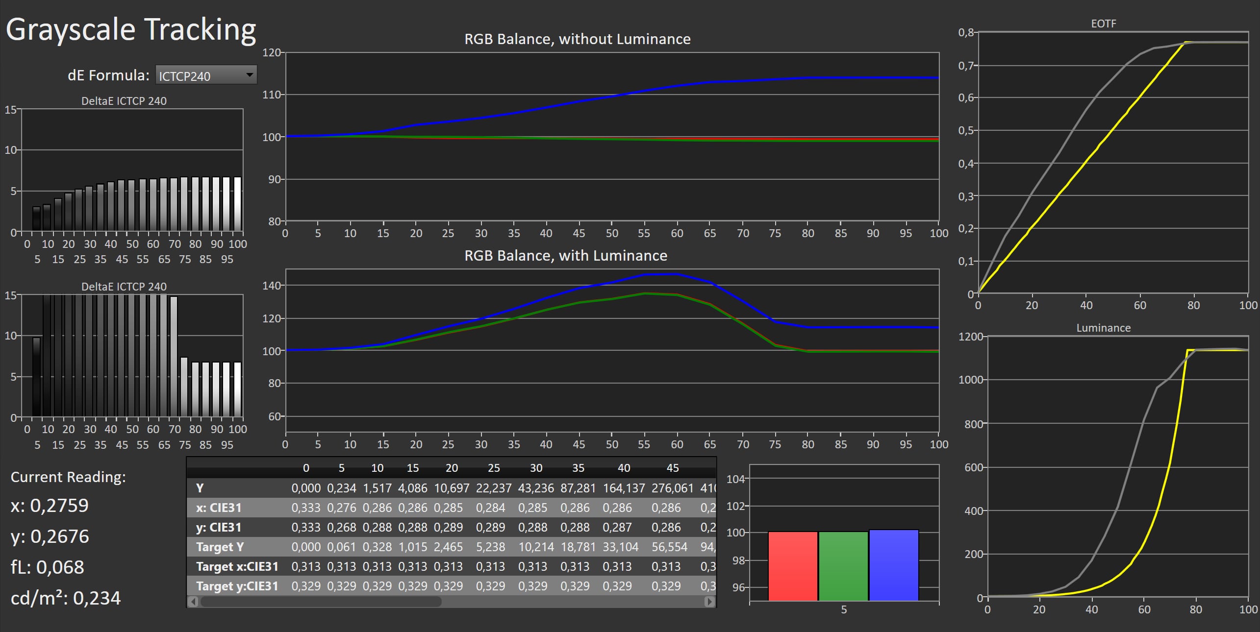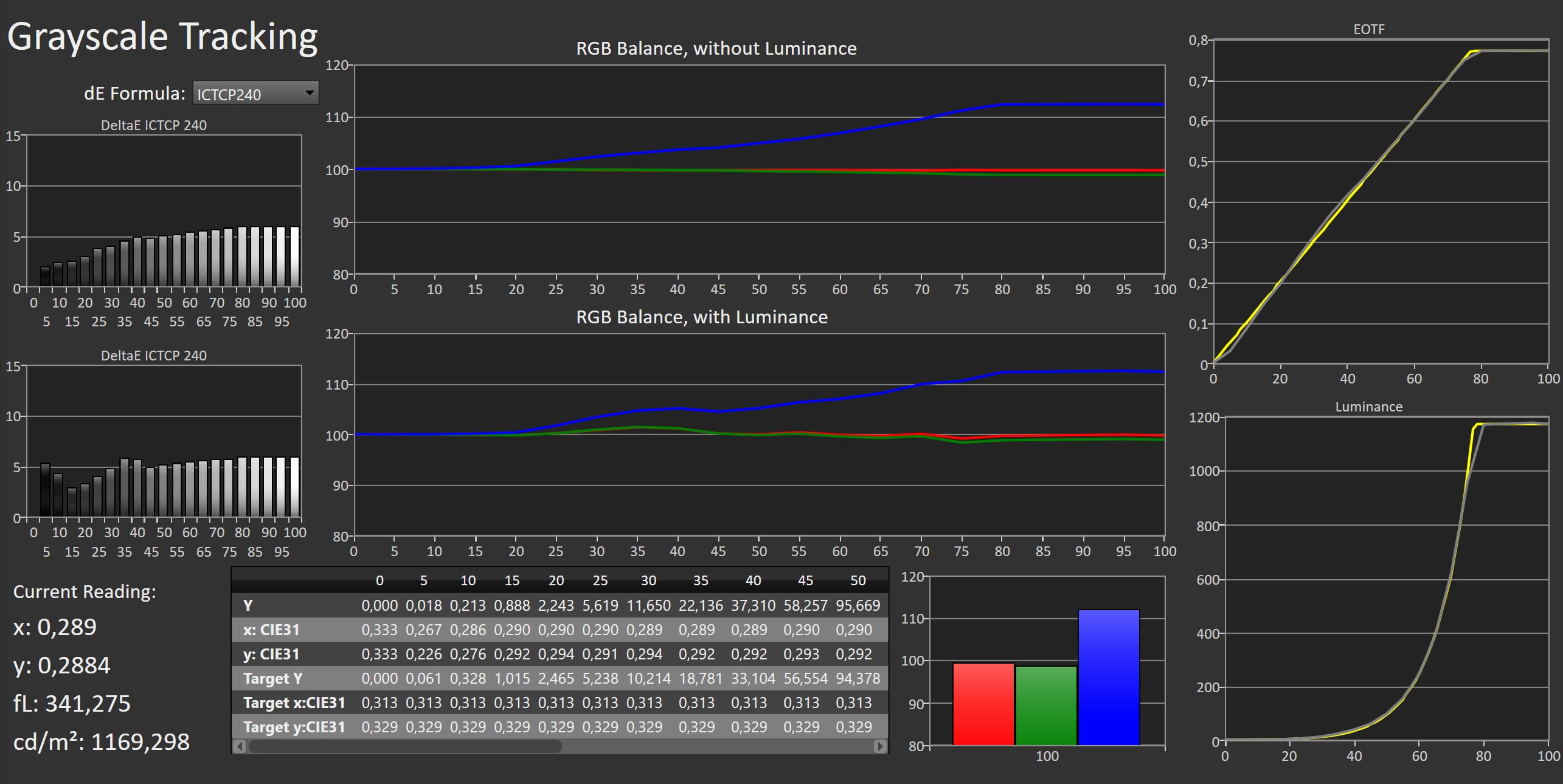 For den mest præcise billedkvalitet er Filmmaker Mode stadig det bedste valg — både i SDR og HDR. Alternativt kan du tage udgangspunkt i Cinema-profilen, som benytter en lidt lavere gamma og derfor egner sig bedre til visning i moderat lyse rum. Den anvender desuden minimal billedbehandling, hvilket er passende til en bred vifte af indhold (det vender vi tilbage til senere). Game-profilen er derimod tydeligt kølig i farvetonen og tilføjer både støjreduktion og ekstra skarphed – begge dele unødvendige for konsol. Da spilgrafik gengives i realtid, får man ingen fordel af denne type behandling. Foretrækker du et mere naturligt, referencepræget billede til spil, kan du justere Game-tilstanden efter de samme indstillinger som i Filmmaker Mode. Input lag blev målt til 10,8 ms ved 4K60 og 5,9 ms ved 2K120 — fremragende resultater, der giver en responsiv spiloplevelse. I HDR10 målte vi en maksimal lysstyrke på cirka 1200 nits, en beskeden forbedring på cirka 10% sammenlignet med C4. Lysstyrken over hele skærmen ligger fortsat omkring 200 nits. Det er pæne resultater, men vi venter stadig på, at C-serien når op på 350 nits i fuldskærmslysstyrke, som vi så i vores test af LG G5. Det vil reducere synligheden af den automatiske lysbegrænser (ABL) markant, både i SDR og HDR. Farverummet fra LG's WOLED-paneler ligger stabilt på omkring 96–98% af DCI-P3 og 70% af Rec.2020. Kun QD-OLED og de nyeste generationer af WOLED-paneler, som dem i LG G5, leverer et bredere farverum. Da næsten alt HDR-filmindhold dog er masteret til DCI-P3, er forskellen i praksis beskeden.Målte billedprofiler